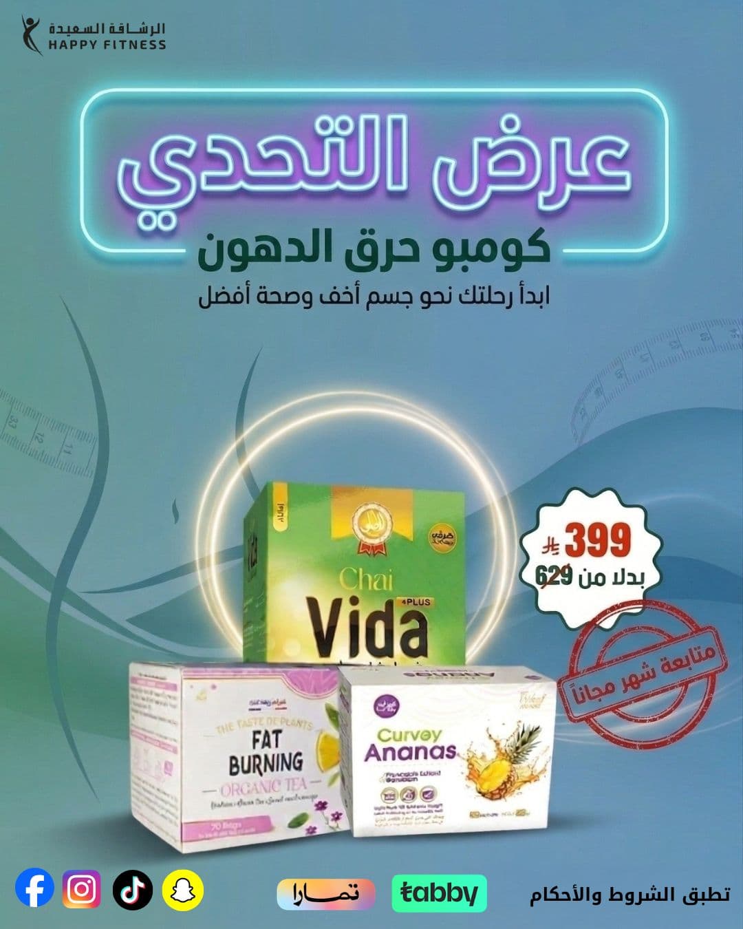 يشمل شاي فيدا بلص وكيرفي اناناس وشاي الفرنسي لحرق الدهون — حل متكامل يدعم حرق الدهون، تحسين الهضم، وتقليل الانتفاخ. احصل على نشاط وخفة كل يوم.