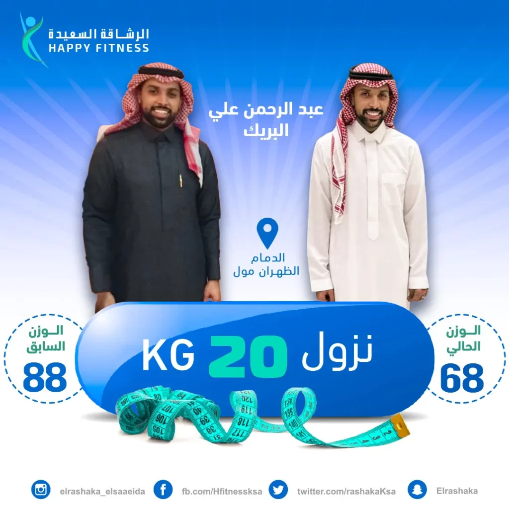 عبدالرحمن البريك احد ابطال الرشاقة السعيدة نجح في انقاص وزنه 20 كيلوجرام في 9 زيارات فقط من التحدي والالتزام بالبرنامج الغذائي والمنتجات المساعدة ، ونتمنى له دوام الصحة والعافية وحياة سعيدة