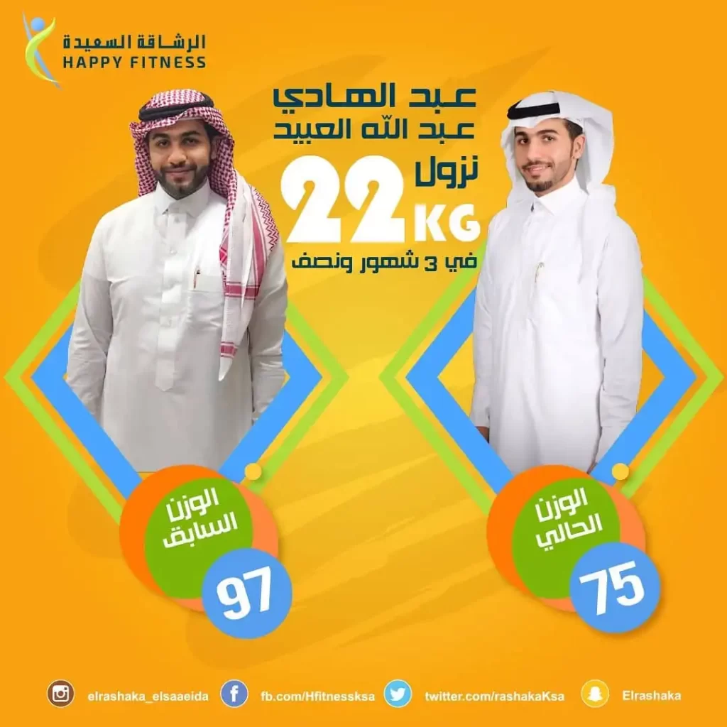 عبدلله الهادي احد ابطال الرشاقة السعيدة نجح في انقاص وزنه 22 كيلوجرام في خلال فترة 3 شهور من التحدي والالتزام بالبرنامج الغذائي والمنتجات المساعدة ، ونتمنى له دوام الصحة والعافية وحياة سعيدة 🙂